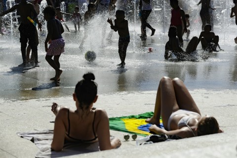| Des enfants et des adultes se rafraîchissent dans les fontaines du Parc André Citroën, le 5 août à Paris pendant un épisode de canicule. |