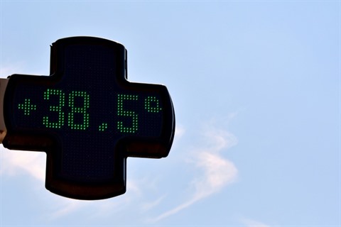 | Un thermomètre sur la façade d'une pharmacie à Toulouse indique 38,5°C, le 6 août lors d'un épisode de canicule. |