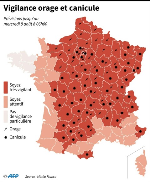 Trente-neuf départements étaient mardi 7 août en vigilance orange "orages". Au total, 60 départements sont en vigilance orange (46 pour canicule, 39 pour orage, mais 25 d'entre eux ont les deux vigilances).