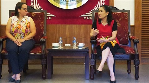 | La vice-ministre vietnamienne de la Culture, des Sports et du Tourisme, Dang Thi Bich Liên (droite), et la chargée de mission de la coopération internationale de la région Nouvelle-Aquitaine, Pascale Maitreau, le 19 septembre à Hanoï. |