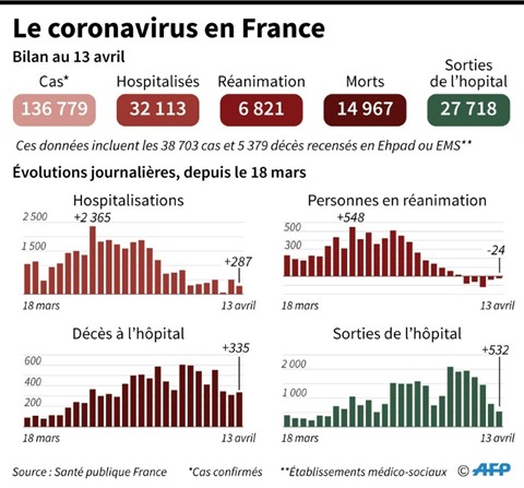 Par ailleurs, mardi soir 14 avril, 6.730 patients dans un état grave se trouvaient en réanimation, soit un solde de -91 par rapport à lundi 13 avril. Cet indicateur, qui dénote la pression sur le système hospitalier qui ne comptait avant la crise que 5.000 lits de réanimation, est très suivi par les spécialistes.