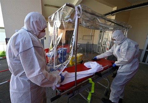 | Deux agents sanitaires vérifient une civière de sarcophage, désinfectée après avoir transporté un patient au CHU de Montpellier dans l'Hérault, le 14 avril. |