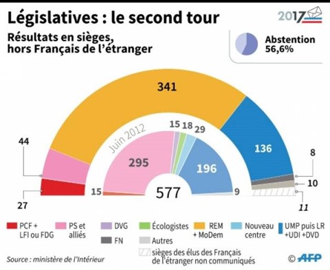 Le voilà doté de 341 sièges, selon les résultats du ministère de l’Intérieur à 23h00 GMT (hors circonscriptions de l’étranger), très largement au-delà de la majorité absolue de 289 sièges. Mais l’abstention record (plus de 56%) montre que "les Français n’ont pas voulu signer de chèque en blanc", comme l’a dit le porte-parole du gouvernement Christophe Castaner.