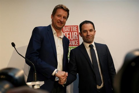 | Yannick Jadot (gauche) et Benoît Hamon, le 26 février à Paris. |