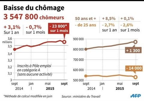 | Évolution mensuelle du chômage de septembre 2014 à septembre 2015. |