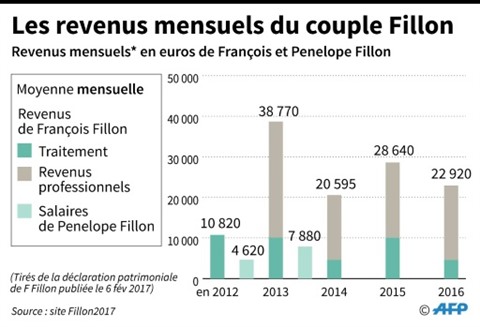 | Les revenus mensuels du couple Fillon de 2012 à 2016. |