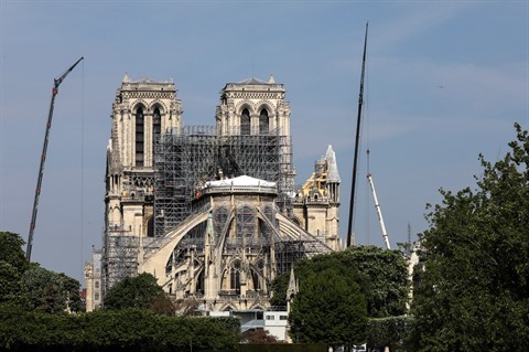 | Des échaffaudages installés sur Notre-Dame gravement endommagée par un incendie, le 7 mai 2019 à Paris. |