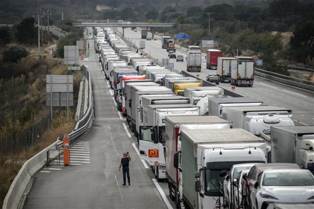 | Des camions font la queue sur une route à Boulou, en France, le 1er février 2024. |