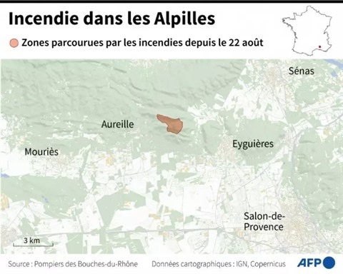| Carte localisant l'incendie dans les Alpilles démarré le 22 août. |