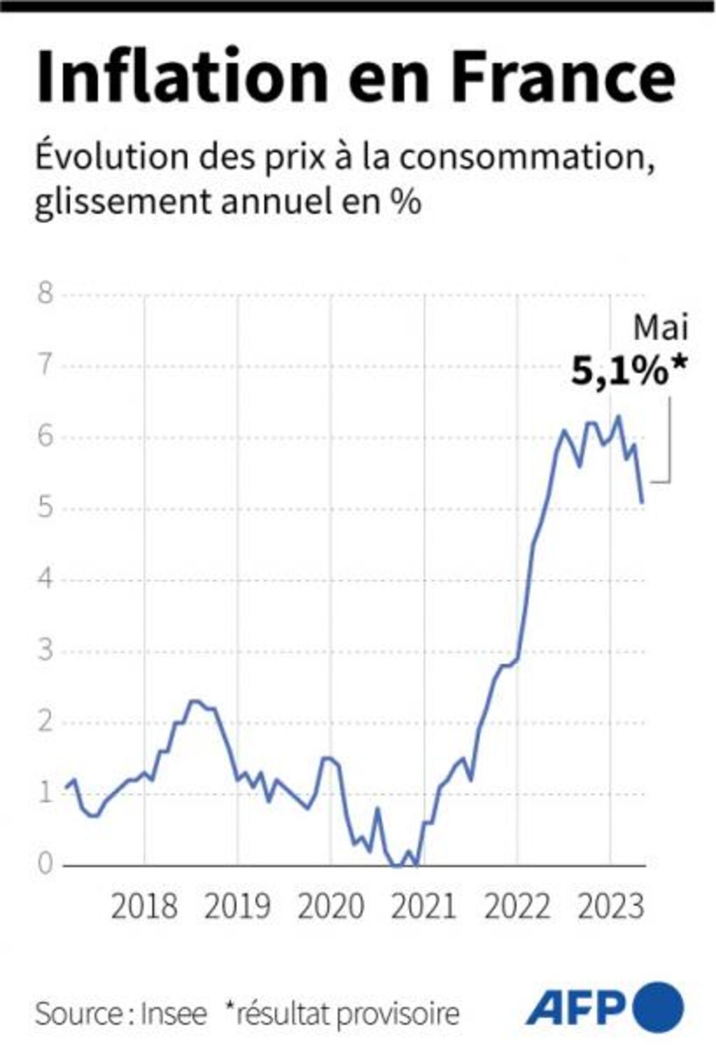 Les prix ont continué à augmenter sur un an en mai, de 5,1%, mais moins fortement que les mois précédents (5,9% en avril et 6% en début d'année), selon l'Insee. C'est un point bas depuis avril 2022.