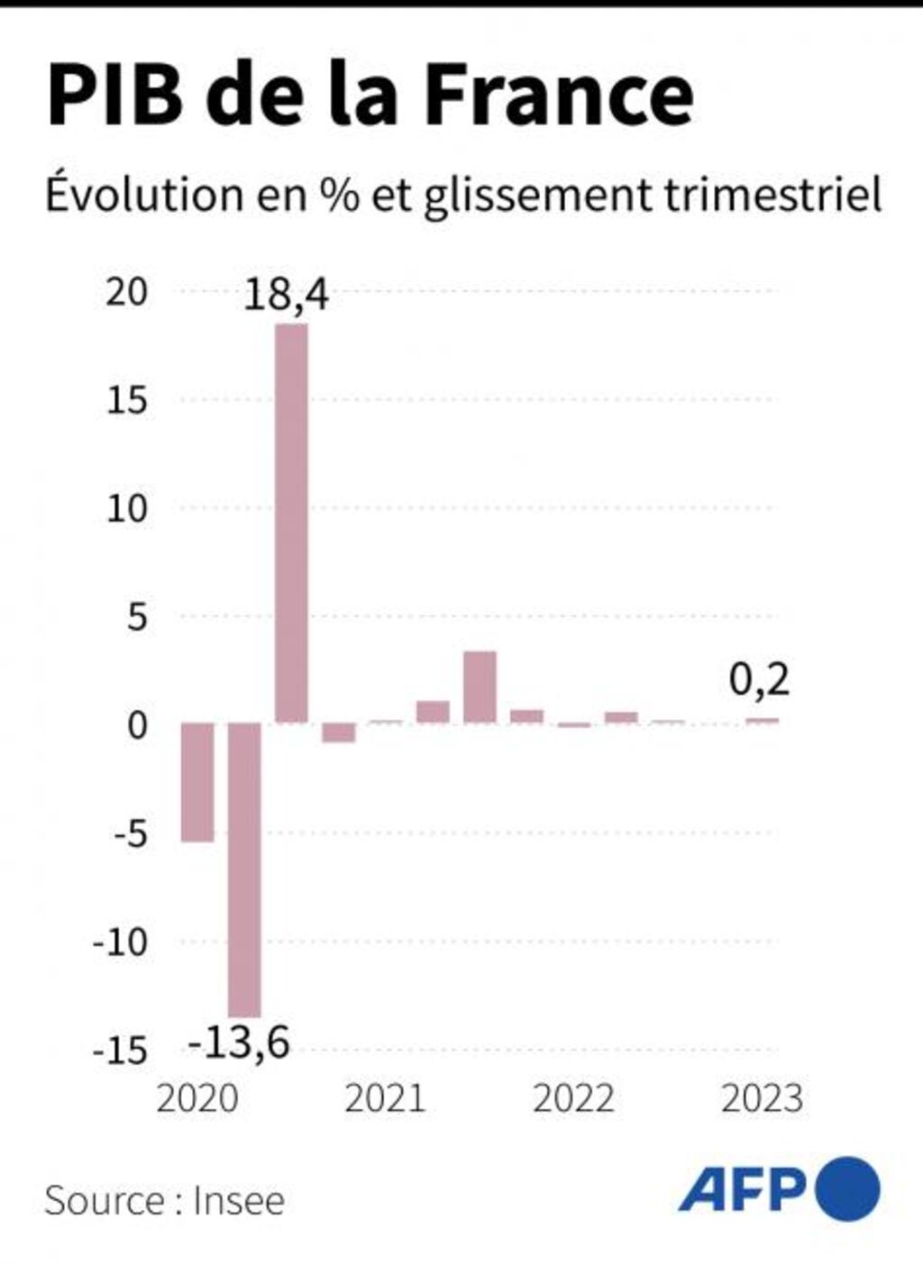 La petite progression du PIB au premier trimestre fait suite à une atonie de la croissance sur les trois derniers mois de 2022, révisée en baisse de 0,1 point comme celle de l'ensemble de l'an dernier, à 2,5%.