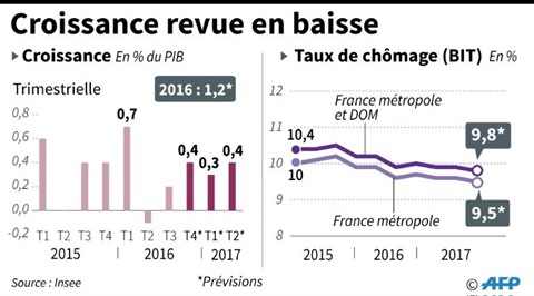 Le taux de chômage devrait pour sa part légèrement reculer, pour atteindre à la mi-2017 9,5% de la population active en métropole et 9,8% avec l'outre-mer, grâce à un nombre d'emplois créés suffisant pour absorber la hausse de la population active.