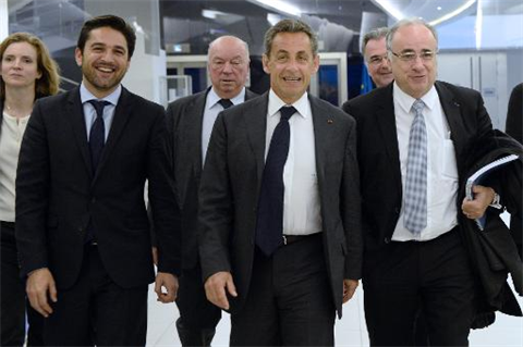 | Le président de l'UMP, Nicolas Sarkozy (centre), au siège du parti, le 6 janvier à Paris. |