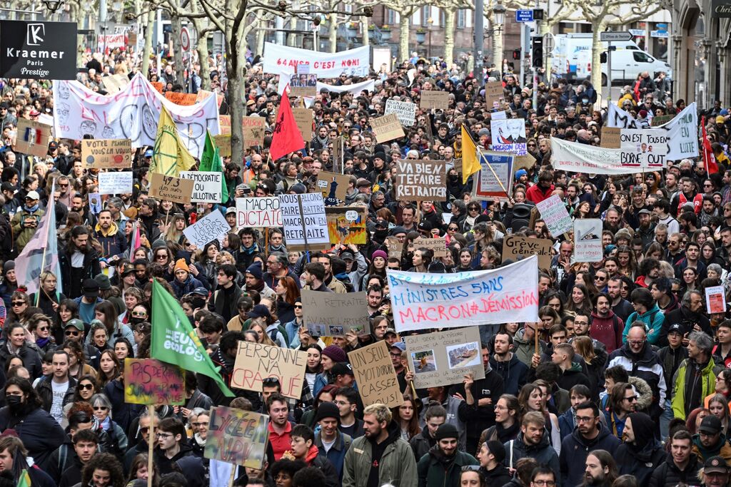 | Des manifestants contre la réforme de retraites à Strasbourg, en France. |