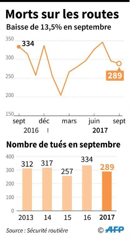 Quarante-cinq morts de moins en septembre 2017 qu'en septembre 2016 (289 morts, -13,5%) ; 73 de moins sur les douze derniers mois (-2,1% par rapport aux douze derniers mois précédents). Alors qu'Emmanuel Macron doit présenter "d'ici la fin d'année", selon une source proche du dossier, un plan de lutte contre l'insécurité routière, la tendance à la hausse enregistrée depuis 2014 semble marquer le pas.
