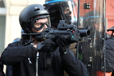 | Un policier armé d'un LBD 40 lors de la manifestation des "gilets jaunes" du 9 février à Paris. |