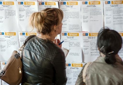 | Des femmes consultent un panneau d'offres d'emploi le 17 avril dans une agence Pôle emploi à Lens. |
