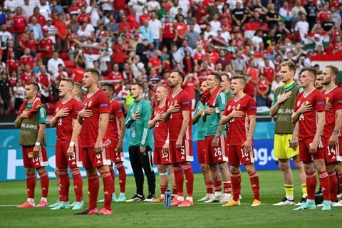 | Les joueurs hongrois saluent les supporters à la fin du match de football du groupe F de l'UEFA EURO 2020 entre la Hongrie et le Portugal à la Puskas Arena de Budapest, le 15 juin. |