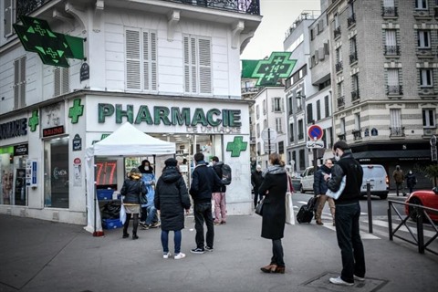 | Des personnes attendent de se faire tester au COVID-19 dans une pharmacie, le 23 décembre à Paris. |