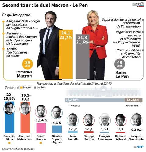 Au terme d'une campagne à rebondissements qui a tenu les Français en haleine jusqu'au bout, le premier tour de dimanche 23 avril a désigné deux candidats aux arguments "anti-système", mais avec deux visions radicalement différentes sur l'avenir de la France en Europe.