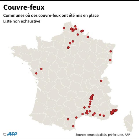 | Cartes localisant les communes françaises ayant mis en place des couvre-feux pour lutter contre la propagation du nouveau coronavirus. |