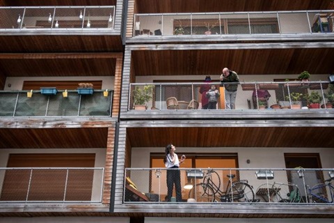 | Discussions entre voisins confinés, depuis leur balcon, le 20 mars |