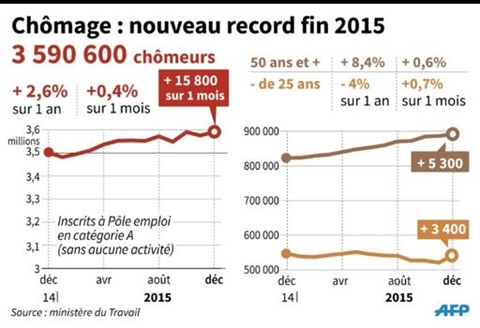 Pour l'heure, le gouvernement n'a pas réussi à réduire le chômage. Selon le ministère du Travail, le nombre de demandeurs d'emploi sans activité a augmenté de 15.800 personnes (+0,4%) en décembre, concluant l'année sur un record de 3,59 millions de chômeurs en métropole. Sur l'ensemble de l'année, Pôle emploi a accueilli 89.900 chômeurs supplémentaires (+2,6%), même s'il s'agit de la plus faible hausse depuis 2010.