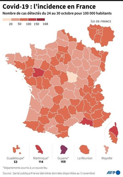 | Nombre de cas détectés du 24 au 30 octobre par département, pour 100.000 habitants, selon Santé publique France. |