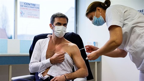 | Le ministre de la Santé, Olivier Véran, qui est également médecin, est vacciné avec une dose AstraZeneca le 8 février au centre hospitalier de Melun, en tant que soignant. |