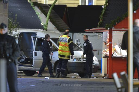 | Des policiers inspectent la camionnnette qui a foncé sur un marché de Noël dans le centre-ville de Nantes, le 22 décembre. |