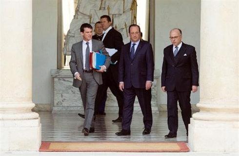 | Manuel Valls, François Hollande et Bernard Cazeneuve à la sortie du Conseil des ministres, le 23 avril à |