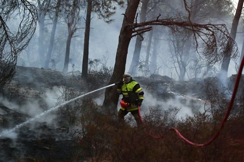 | Un pompier tente d'éteindre un incendie dans une forêt de Port-de-Bouc commune voisine de Marseille (Bouches-du-Rhône), le 10 août. |
