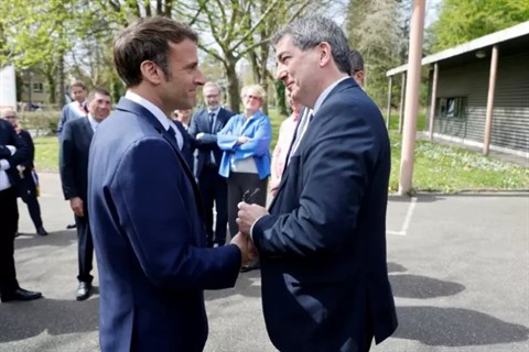 | Le président de la région Grand Est Jean Rottner, ici avec Emmanuel Macron (gauche), le 12 avril, est pressenti pour entrer au gouvernement. |