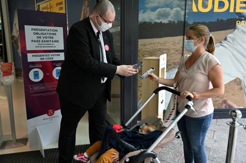 | Vérification du pass sanitaire le 16 août à l'entrée du centre commercial Beaugrenelle à Paris. |