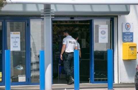 | La police entre dans le supermarché Leclerc de La Seyne-sur-mer où une femme a blessé au cutter deux personnes le 17 juin en criant "Allah akbar". |