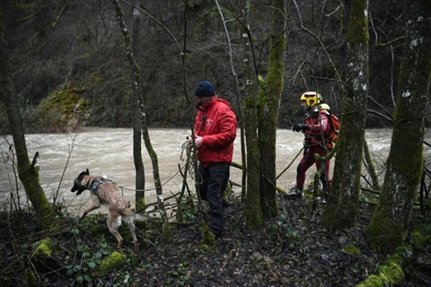 | Sur une berge de la Brida, une équipe de secours est à la recherche du pompier disparu à Détrier, en Savoie, le 4 janvier. |