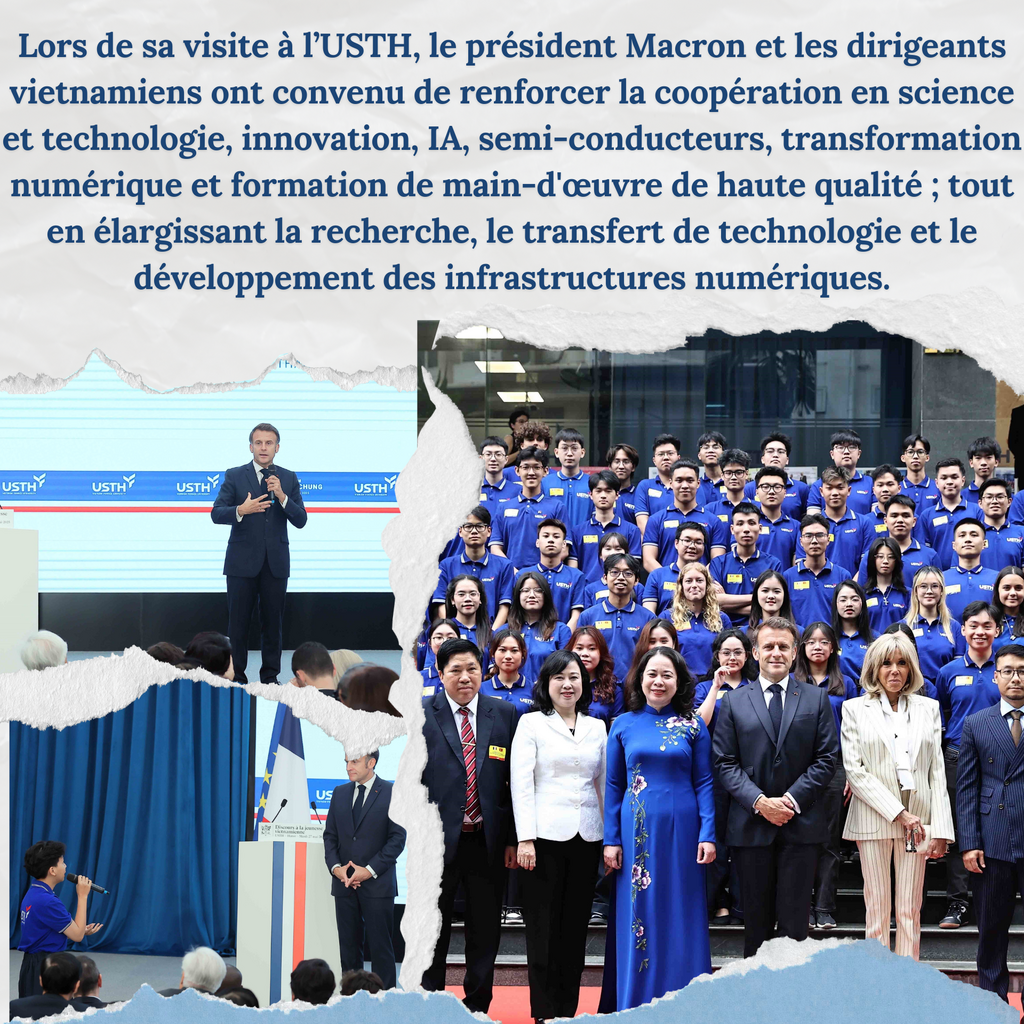 Troisièmement, la formation des jeunes Vietnamiens est un axe majeur. Le président Macron a prononcé un discours à l'Université des sciences et techniques de Hanoï (USTH), une université franco-vietnamienne, soulignant la volonté de développer l'USTH, le Centre franco-vietnamien de gestion (CFVG) et le programme de formation des ingénieurs d'excellence (PFIEV). L'USTH connaît un "développement rapide, tant quantitatif que qualitatif", avec davantage de diplômes répondant aux besoins du pays et un plus grand nombre de masters, diplômes d'ingénieurs et doctorats. La France encourage également les jeunes Vietnamiens à venir étudier en France, offrant "de nombreuses bourses (trois millions d'euros par an)", ce qui fait du Vietnam "le troisième pays bénéficiaire du système de bourses françaises". Même sans bourse, étudier en France est abordable car les études sont largement subventionnées par l'État, offrant un niveau international d'excellence.