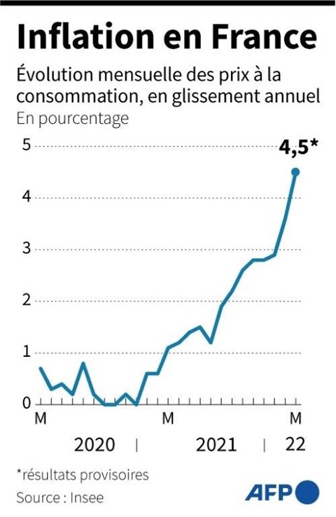 L'Insee anticipait mi-mars, dans sa note de conjoncture mensuelle, une inflation stabilisée autour de 4,5% au deuxième trimestre 2022. "La barre des 5% pour l'indicateur national d'inflation pourrait être dépassée au deuxième trimestre", estime ING, qui s'attend ensuite à une baisse rapide des prix à la consommation.