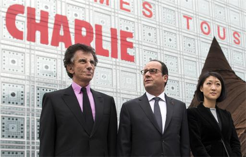 | Le président français Francois Hollande (centre), la ministre de la Culture, Fleur Pellerin, et le président de l'Institut du monde arabe, Jack Lang, devant l'Institu |