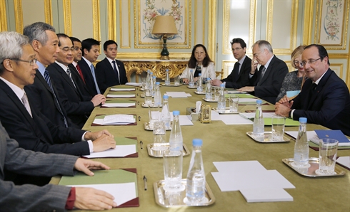 | Le président français François Hollande (droite) et le Premier ministre singapourien, Lee Hsien Loong (2e à gauche), le 28 octobre à Paris |