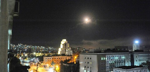 | Photo provenant du site internet de l'agence de presse officielle syrienne le 14 avril 2018 d'une explosion dans la banlieue de Damas après des frappes aériennes d'Occidentaux. |