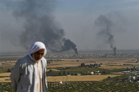 | Des colonnes de fumée s'élèvent au-dessus de la ville syrienne de Ras al-Aïn, vue depuis la Turquie, le 11 octobre 2019. |