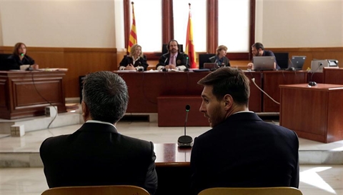 | Lionel Messi (droite) et son père, face aux juges, au tribunal de Barcelone, le 2 juin. |