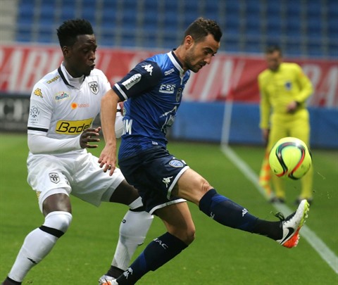 | Le milieu de terrain international tunisien Fabien Camus (droite), alors sous le maillot de Troyes, contre Angers en Ligue 1, le 2 avril 2016 à Troyes. |