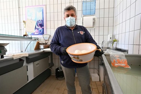 | Un fromager montre des boules de mozzarella, le 24 avril près de Naples |
