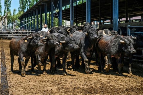| Des bufflonnes près d'une fromagerie, le 24 avril près de Naples, en Italie. |