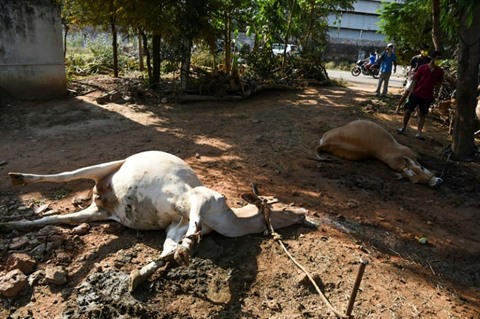 | Des vaches mortes après une fuite de gaz dans une usine de LG Polymers à Visakhapatnam le 7 mai. |