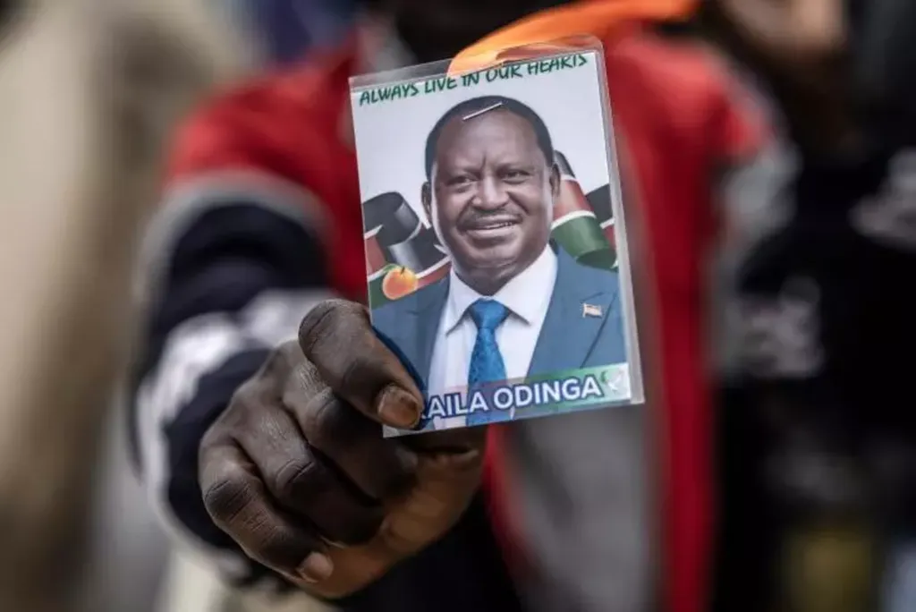 | Un manifestant tient une image représentant l'ex-Premier ministre kényan Raila Odinga, le 17 octobre 2025 à Nairobi. |