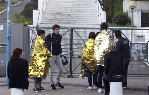 | Des élèves dans des couvertures de survie devant le lycée Tocqueville à Grasse. |