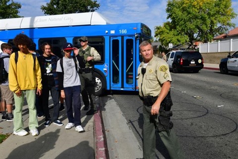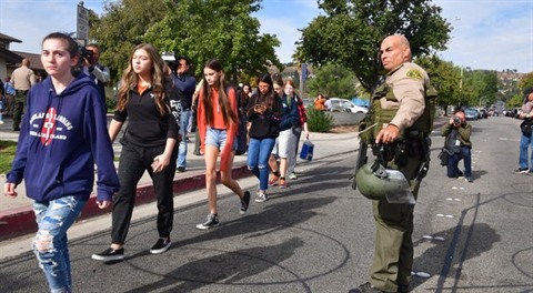| Des élèves du lycée Saugus à Santa Clarita (Californie) se mettent en rangs sous la protection d'un adjoint du shérif après la fusillade, le 14 novembre. |